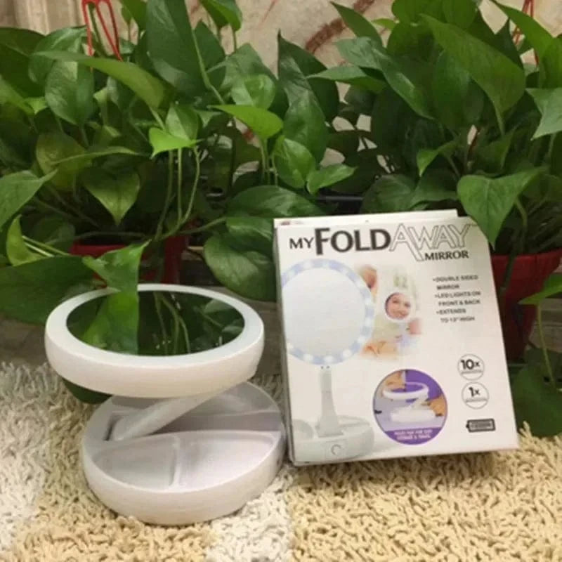 The Foldaway Mirror is a mirror that can be quickly folded out and used in any room of the house. It rests on its own stand and will also swivel and rotate. This mirror is double-sided, with one side giving you a realistic view of your face while the other side will show it at 10 times the size. What's more, with the press of a button at the bottom of the stand, you can power up LED lights that will illuminate both sides. When you are finished, My Foldaway Mirror will collapse back down into the base for easy storage and transportation. When the mirror is extended there are compartments where you can store small accessories such as hair ties or clips. The is a mirror that can be quickly folded out and used in any room of the house. It rests on its own stand and will also swivel and rotate. This mirror is double-sided, with one side giving you a realistic view of your face while the other side will show it at 10 times the size. What's more, with the press of a button at the bottom of the stand, you can power up LED lights that will illuminate both sides. When you are finished, will collapse back down into the base for easy storage and transportation. When the mirror is extended there are compartments where you can store small accessories such as hair ties or clips.