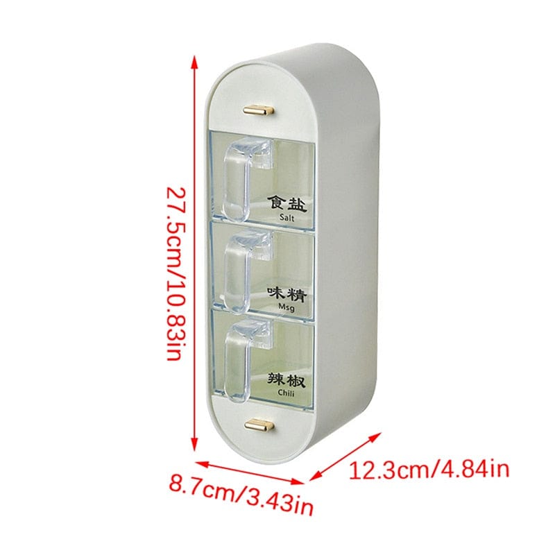 The packaging contains -1 pack of 3 grid transparent seasoning box, including 3 partition seasoner distributors and 3 spoons, with anti -slip tray to protect all seasonings.