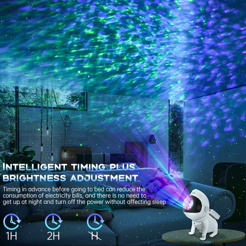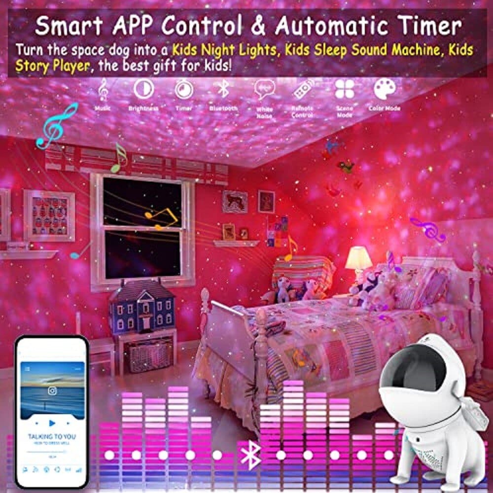 Unique Appearance and Timmer Auto ON/OFF--The luminous starry sky projector is designed with an Space dogs shape, The head of the Space dogs can be rotated 360 by magnetic force, projecting the nebula to any place without restriction.
